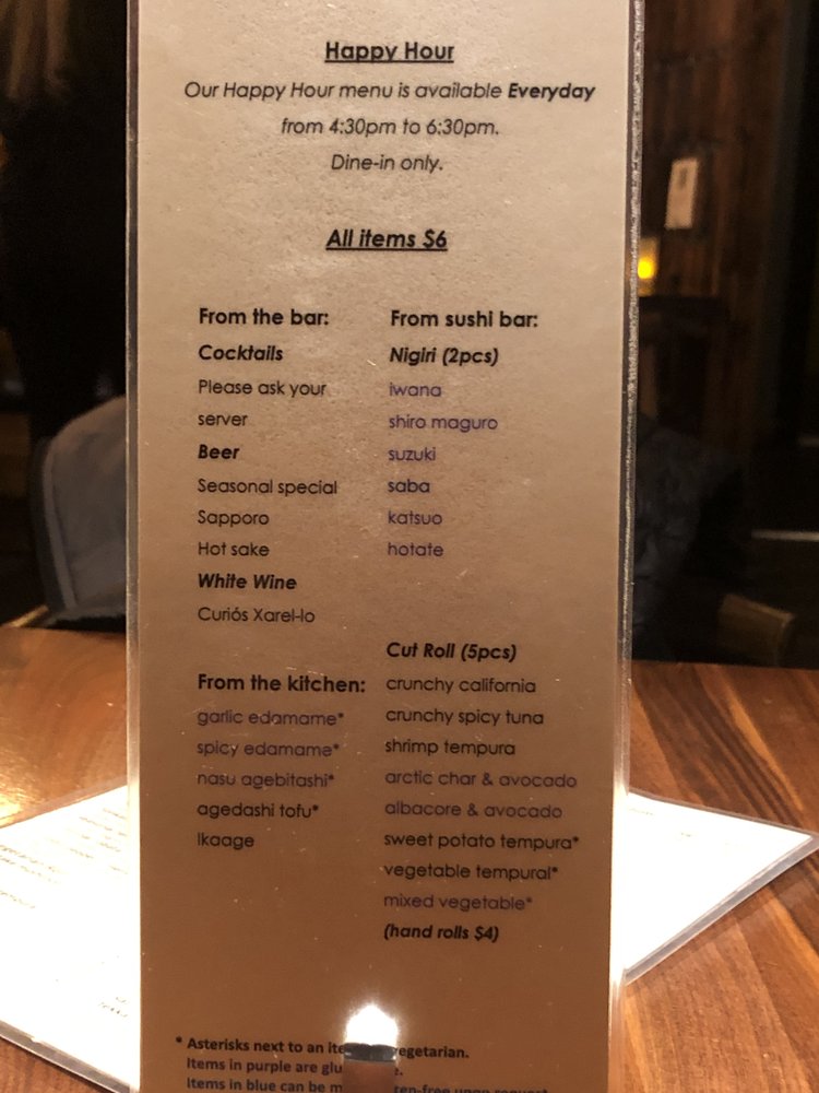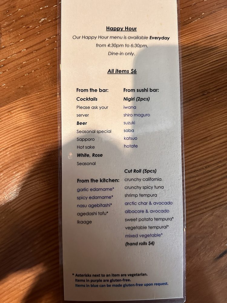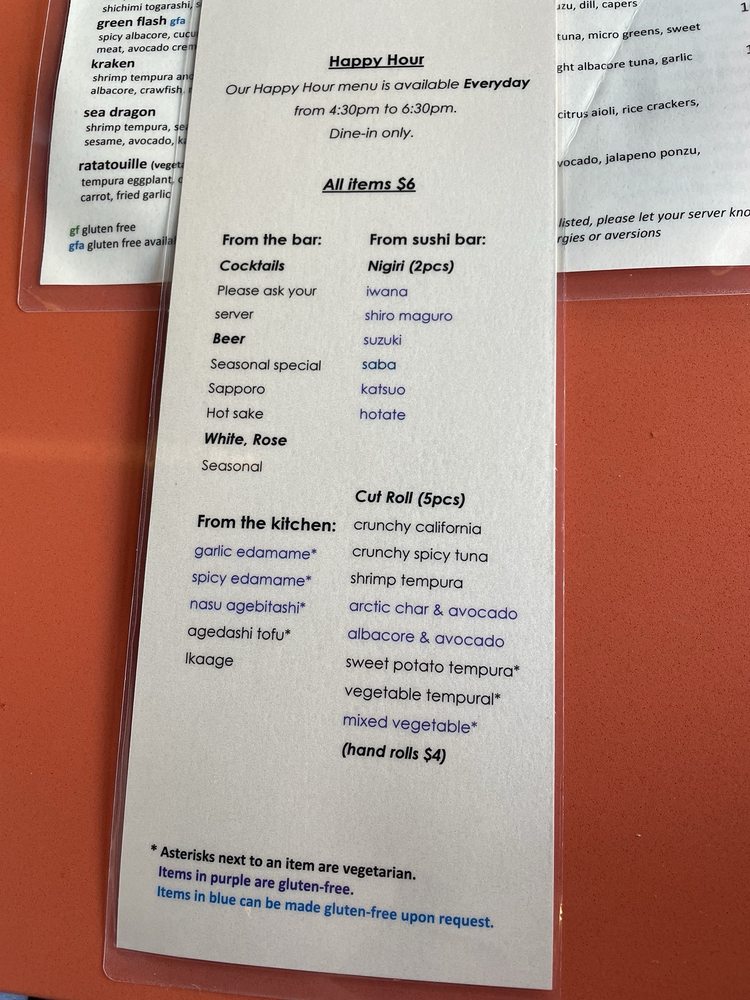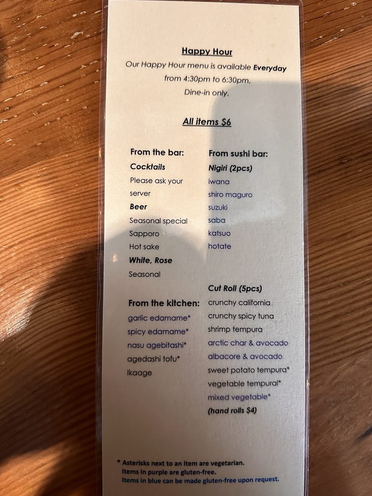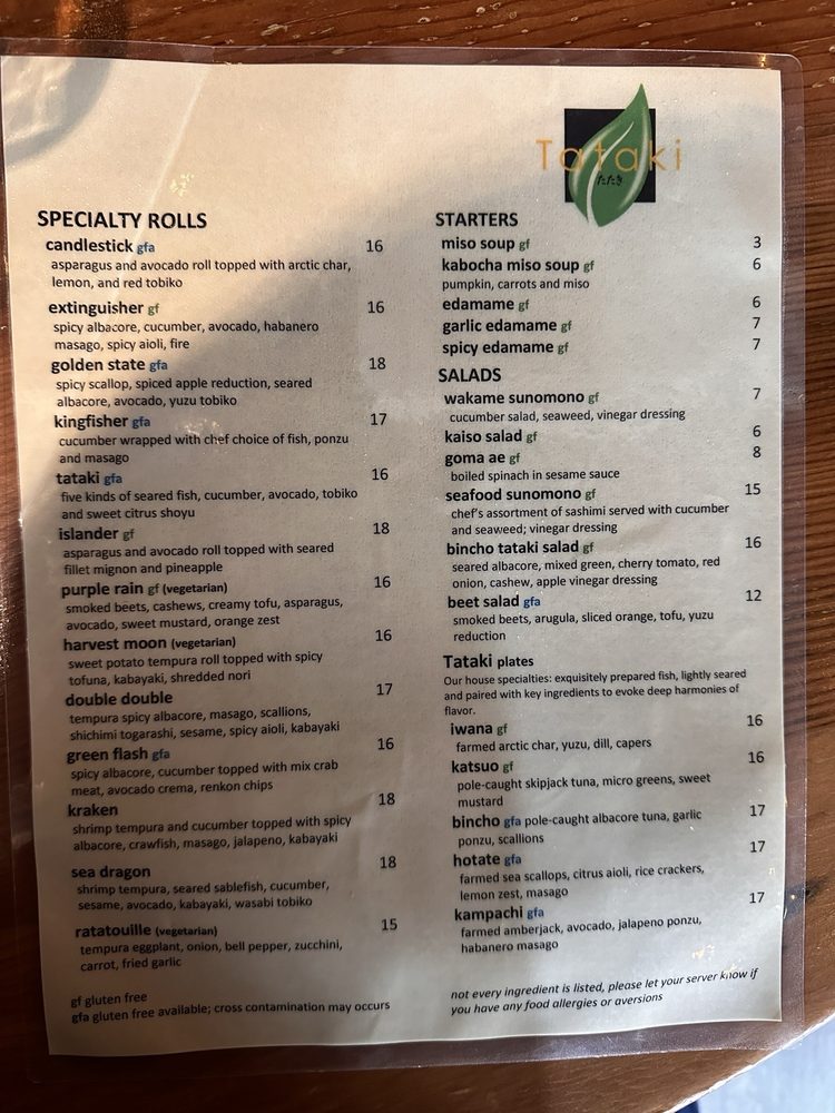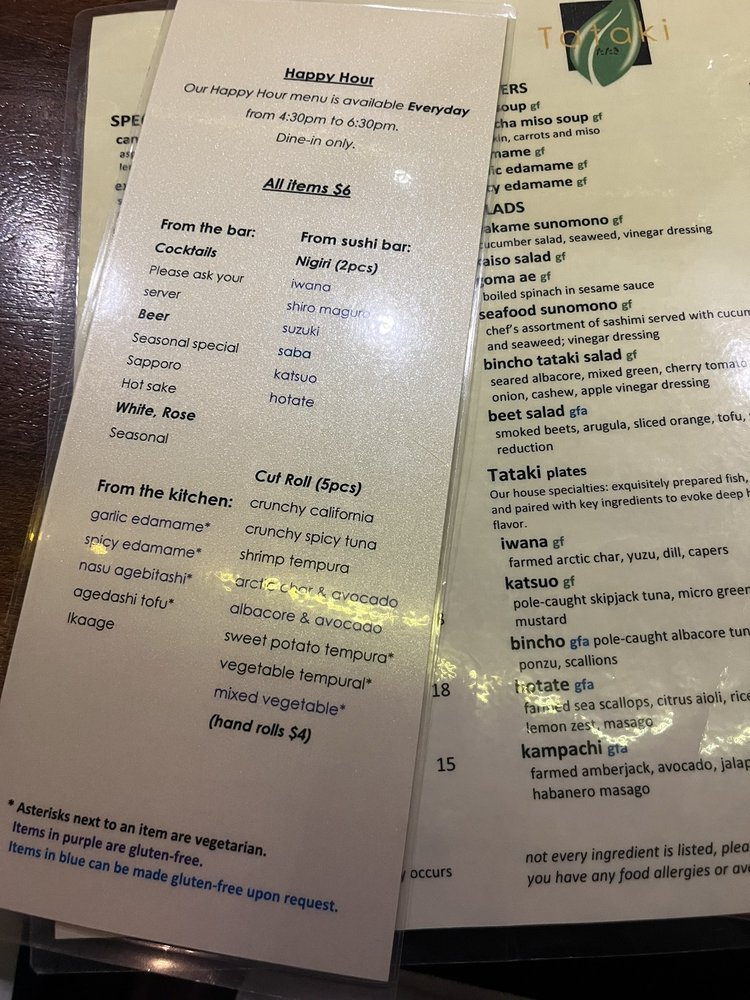 Tataki in San Francisco offers a diverse menu with pescatarian, vegan, and vegetarian options. Their starters include Miso Soup, Kabocha Miso Soup, and Edamame. Specialty Rolls like Candlestick Roll and Extinguisher Roll are popular choices. The salads, such as Kaiso Salad and Seafood Sunomono, are fresh and flavorful. Customers praise Tataki's happy hour deals, with affordable prices for sushi, rolls, and drinks. The friendly service and efficient kitchen ensure a pleasant dining experience. Reservations are recommended, especially during busy happy hour times. Overall, Tataki is a great spot for meeting friends, enjoying delicious food, and taking advantage of their generous deals.
