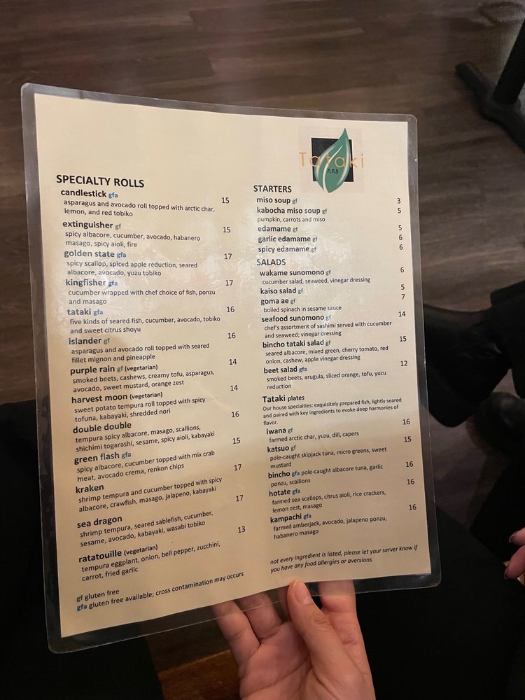 Cucumber, avocado, tobiko and sweet citrus shoyu gluten free available; cross contamination may occurs.
