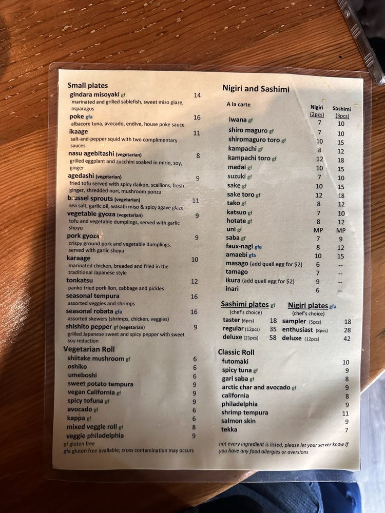 Farmed amberjack, avocado, jalapeno ponzu, habanero masago gluten free available; cross contamination may occur.